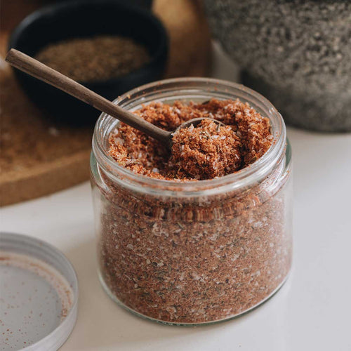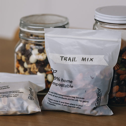 Online orders arrive in 100% home compostable zip lock bags inside a reusable cardboard box sealed with paper tape!