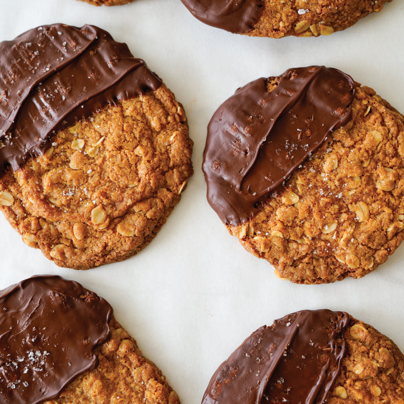 Browned Butter Anzac-Style Biscuits Dipped in Salted Chocolate